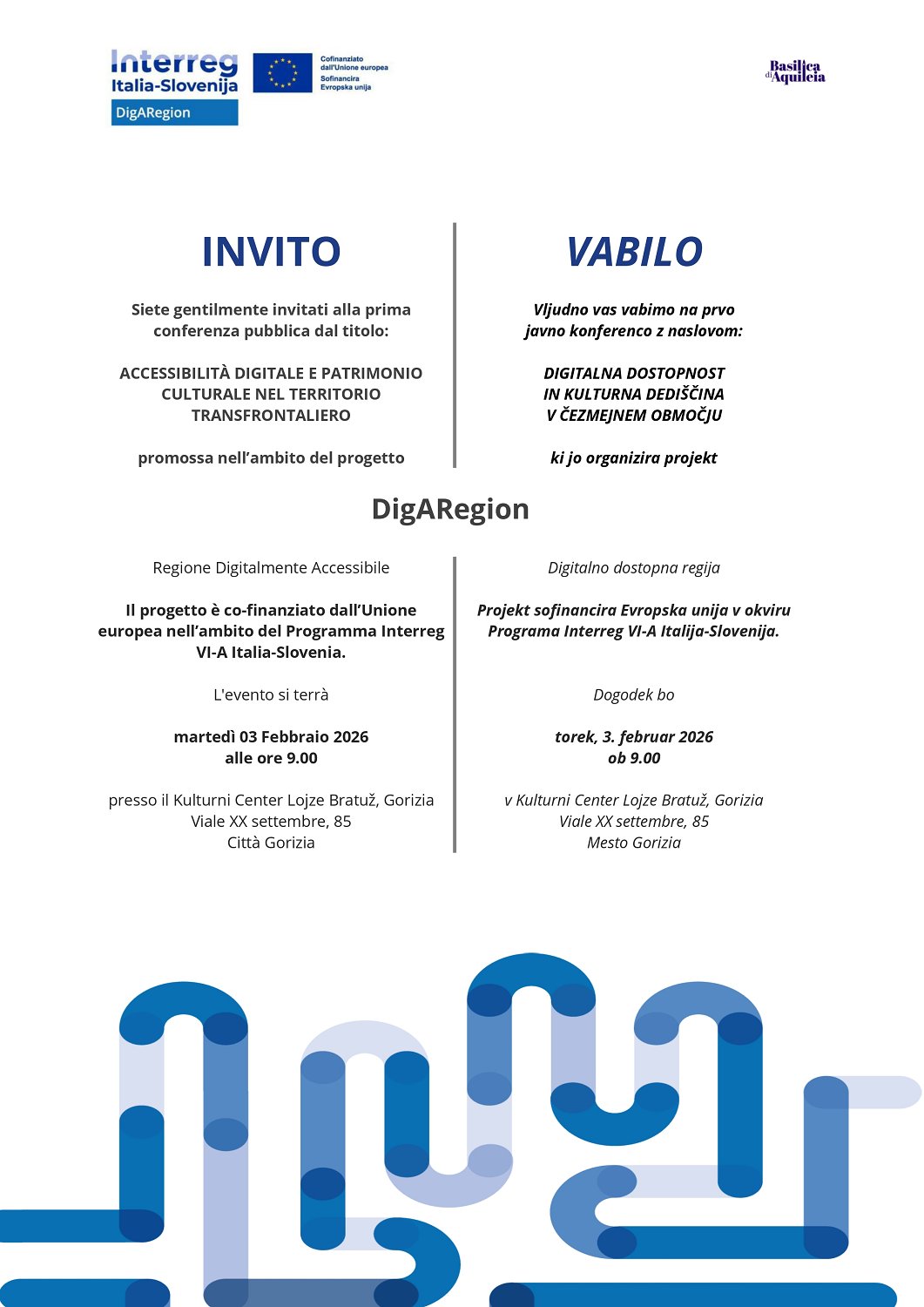 Vljudno vas vabimo na javni dogodek z naslovom DIGITALNA DOSTOPNOST IN KULTURNA DEDIŠČINA V ČEZMEJNEM OBMOČJU, ki bo v torek, 3. februarja 2026, ob 9. uri v Kulturnem centru Lojze Bratuž v Gorici.