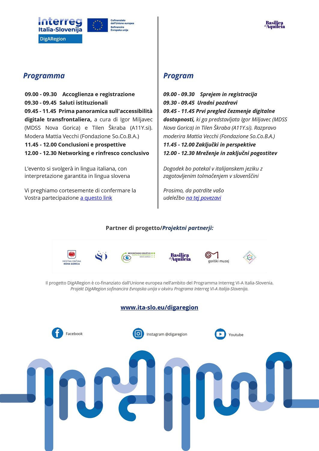 Na javnem dogodku bomo predstavili, kako se izzivi digitalne dostopnosti naslavljajo v okviru čezmejnega projekta DigARegion – Digitalno dostopna regija, katerega namen je organizacijam pomagati pri razumevanju in uresničevanju zahtev digitalne dostopnosti v praksi.